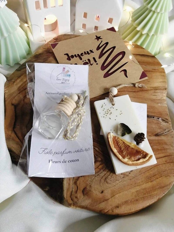 • Fiole de Parfum Voiture “Fleurs de Coton” : Offrez à vos proches une expérience olfactive unique lors de leurs trajets en voiture. Laissez le parfum doux et rafraîchissant des fleurs de coton envelopper l’intérieur de leur véhicule, créant ainsi une atmosphère apaisante.